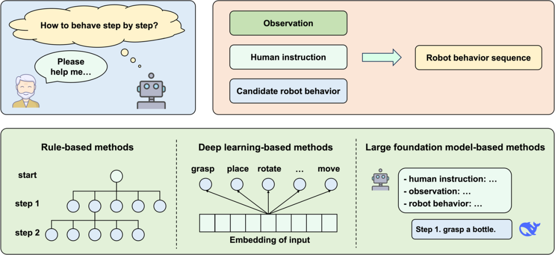 具身决策是指具身智能体在对环境进行观测和理解的基础上,从候选行为集合中推理并生成一条离散的行为序列,以完成既定的人类指令。按照行为类型的不同,具身决策可分为两类:其一是导航决策,如左转、右转、直行等移动指令;其二是任务规划,包括“拿取水瓶、打开冰箱”等具体操作技能,以及由移动与操作组合而成的复杂任务。与非具身决策(如工具使用学习)相比,具身决策的核心特征在于必须在真实物理环境中落地执行。例如,在抓取任务中,智能体不仅需要生成抓取动作,还需判断目标物体是否处于可达范围。近年来,基于大模型的方法逐渐成为具身决策的主流范式,但在任务规划过程中仍面临诸多挑战,例如输出结果往往非结构化、缺乏可执行性以及实际效用不足等问题。