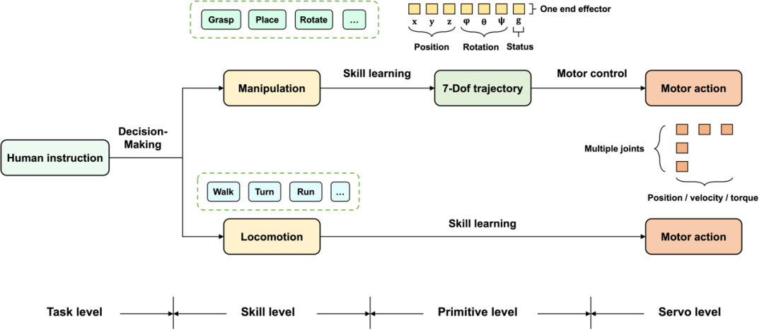 具身执行旨在将高层次的人类指令转化为机器人可执行的具体运动轨迹。其过程如图5所示:人类指令首先经过具身决策模块,被分解为操作技能或运动技能。对于操作技能学习,系统会先生成中间层的七自由度轨迹,再通过关节控制器进一步转化为具体的关节动作;而在运动技能学习中,则可直接输出关节动作,从而实现指令到执行的快速映射。