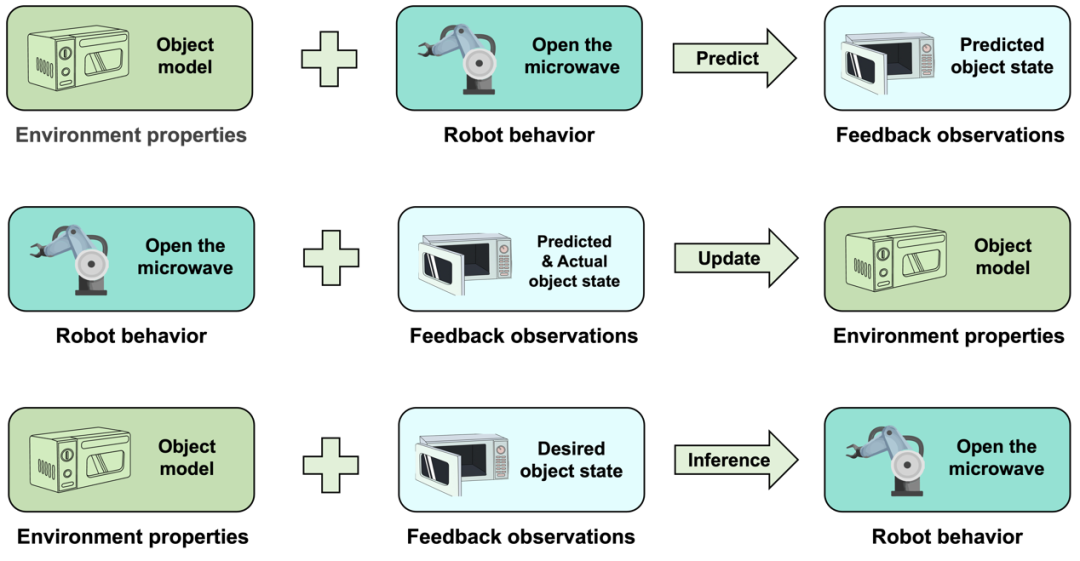 具身感知的重点在于,通过机器人行为增强感知效果。将机器人行为引入感知过程的好处在于:1)获取更多的信息;2)学习机器人行为与观察之间的因果关系。图3描述了机器人行为增强的物体感知。在这一过程中,给定当前物体模型和机器人动作,可以预测下一时间物体状态。给定机器人行为,以及预测的物体状态和真实行为后的物体状态,由此可以更新物体模型。基于前两个步骤,机器人可以通过交互的方式增强其对物体模型的理解。在第三步,给定物体模型,以及希望的物体状态,可以推理出机器人应该执行的动作,由此可以指导机器人与环境交互。