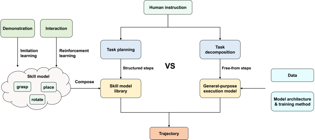 实现机器人的通用操作能力有两种技术路线,如图6所示。第一种技术路线是构建操作技能库,为每个技能单独训练模型。第二种技术路线是构建通用执行模型,基于一个模型完成所有的操作技能。两种技术路线在决策、执行部分均存在差异。技能库的方式必须由任务规划显式地选取技能模型,并给出结构化的规划结果供程序解析。而通用执行模型则可以处理自由形式的规划步骤,无需显式地选取操作模型。由于人类指令的多样性和复杂性,技能库往往需要囊括大量技能,但这会导致任务规划难以选取合适的技能。通用执行模型的方式则不存在这一问题,并且多技能联合训练的方式更有可能在物体、场景、技能和指令维度实现更强的泛化性。我们认为,技能库的方式在现阶段更适合落地,而通用执行模型则代表操作技能学习的未来方向。