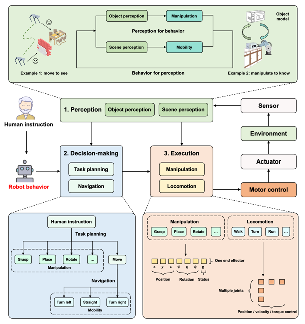 具身感知关注具身智能体如何感受并理解周围环境,主要包括物体感知与场景感知两方面,分别对应于机器人操作与移动行为。物体感知涉及对物体几何形状、铰接结构及物理属性的识别与理解,可应用于物体抓取、铰接物体操作及精密操作等任务。场景感知则旨在构建尺度地图、拓扑图等多层次的场景模型,为机器人移动提供导航与规划支持。具身感知的研究范畴不仅包括面向机器人行为的感知(“感知用于行为”),还包括机器人行为如何增强感知(“行为用于感知”)。例如,机器人可以通过自主移动实现更好地建图和定位,通过操作微波炉探测其铰接结构。