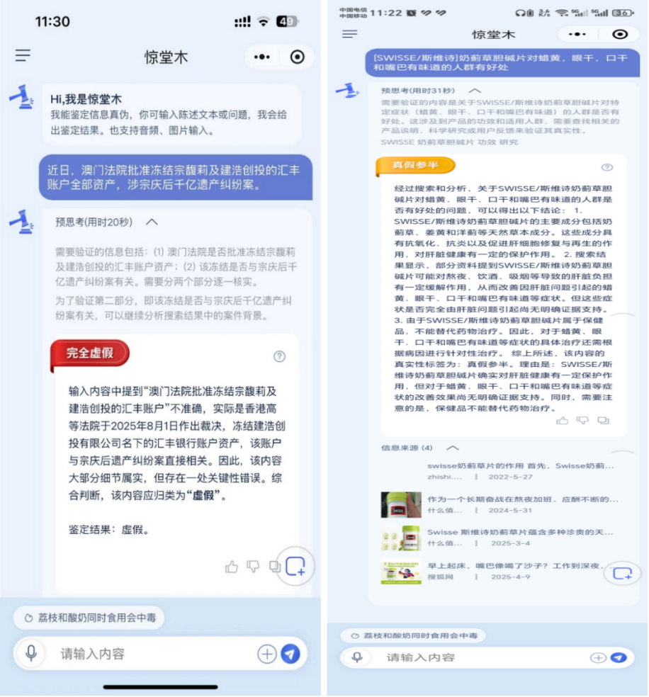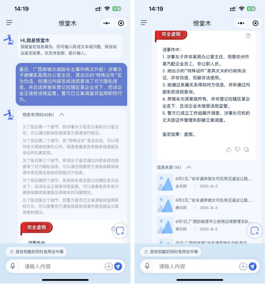 为了应对这一挑战,“惊堂木”利用一个包含10多万个虚假信息样本的大规模数据案例库来训练专用的AI模型,从而更准确地识别出虚假信息。