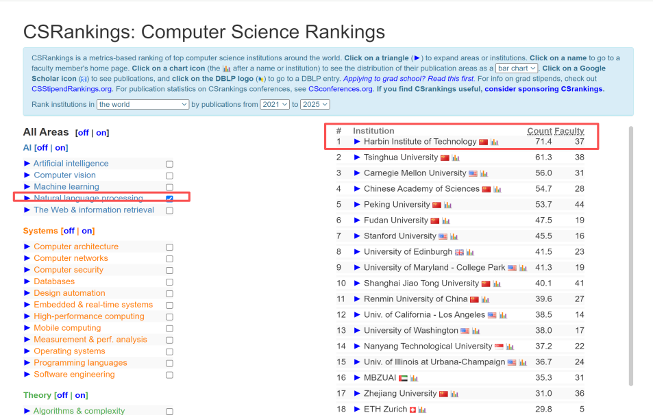 在CS Rankings NLP领域机构近五年(2021-2025)的排名统计中,哈工大列世界第1名。