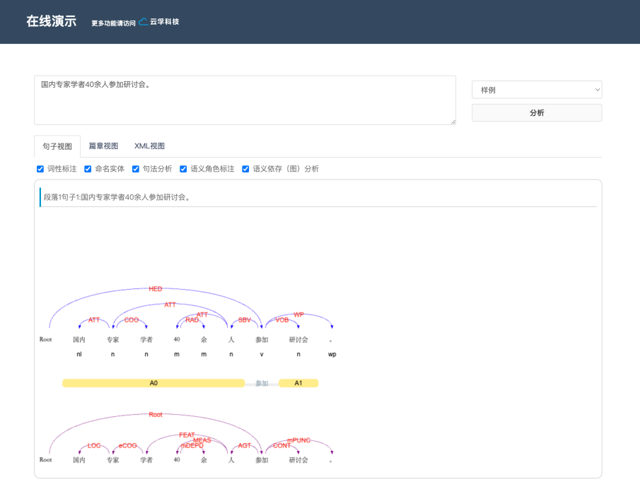 该平台集词法分析(分词、词性标注、命名实体识别)、句法分析(依存句法分析)和语义分析(语义角色标注、语义依存分析)等多项自然语言处理子系统于一体,有效解决了自然语言处理技术入行门槛高,准确率、效率偏低,缺少共享数据和程序资源,重复开发现象严重,结果可视化差,错误分析困难,较难真正支持各类应用研究等众多问题。