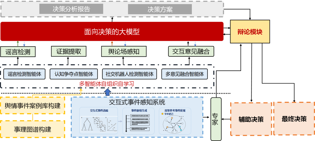 本服务旨在解决政府、高校、媒体等决策主体面对复杂事件时,因信息庞杂、视角多元、真伪难辨而产生的决策片面性问题。其核心目标是实现基于人机协作式辩论的复杂事件决策,即先通过多智能体意见融合生成决策意见,再与人类专家辩论以提升决策准确性。平台创新性地提出了条件事理图谱,通过构建决策领域细粒度条件事理体系,建模事件到决策的演化条件,实现复杂决策环境下事件动态演化过程的精确建模;此外,本平台还采用了由虚假信息检测智能体、认知争夺点智能体等多智能体构建的智能体感知系统获取可用信息,并结合多智能体自组织自学习的意见融合机制生成初步决策意见;最后,本平台提出可批判性生成决策意见的人机协同方法,通过人机辩论的形式生成决策意见,在与人类专家展开迭代论证和辩论的过程,在不同观点与方案之间进行权衡和对比,从而筛选出最佳行动方案。不仅实现了对复杂事件的全面分析,更在“认知”层面提高了决策的深度、广度、准确度。