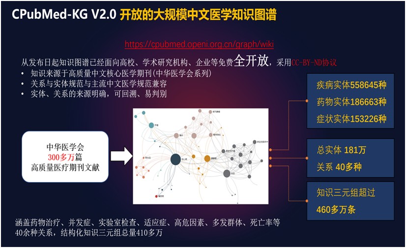 构建的全国最大的开放大规模中文医学知识图谱,服务于全国近200个团队。该知识图谱中的知识来源于中华医学会旗下300余万篇高质量中文核心医学期刊,并及时更新,其关系与实体规范与主流中文医学规范兼容,实体、关系的来源明确,可回溯、易判别,并在以疾病为中心的三元组规模上达到了460万。支撑了由北京协和医院、重庆医大附属儿童医院(国家临床中心)分别牵头的科技部创新2030-“新一代人工智能”重大项目“疑难罕见病人工智能辅助诊断技术研究与临床应用”和“儿科疾病复杂循证知识图谱构建研究”的课题、子课题研究工作。